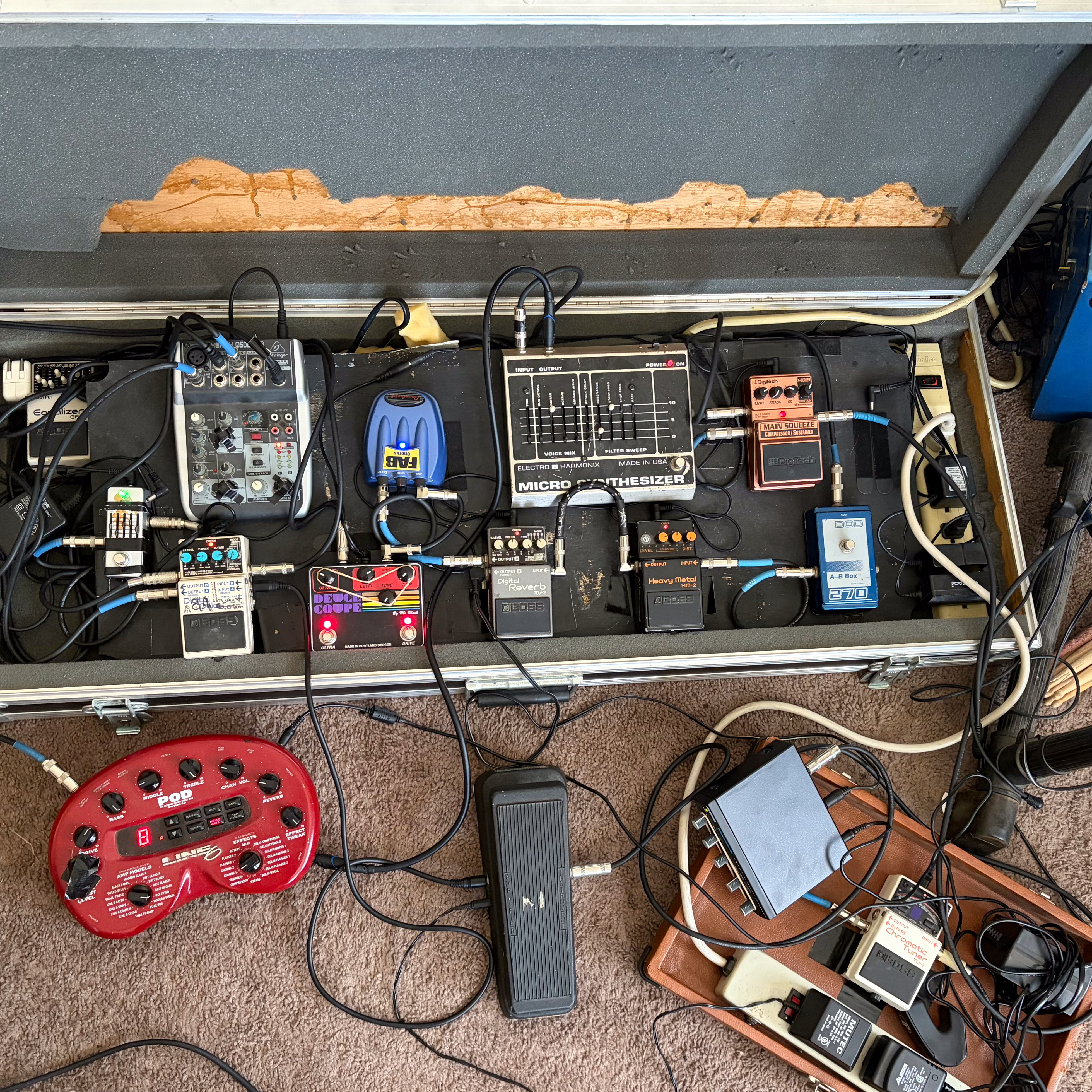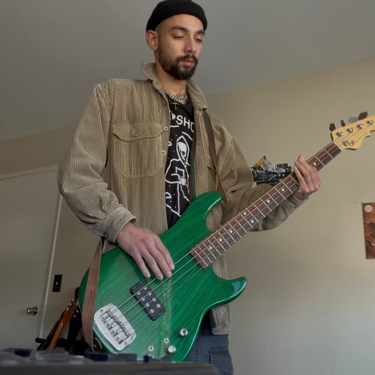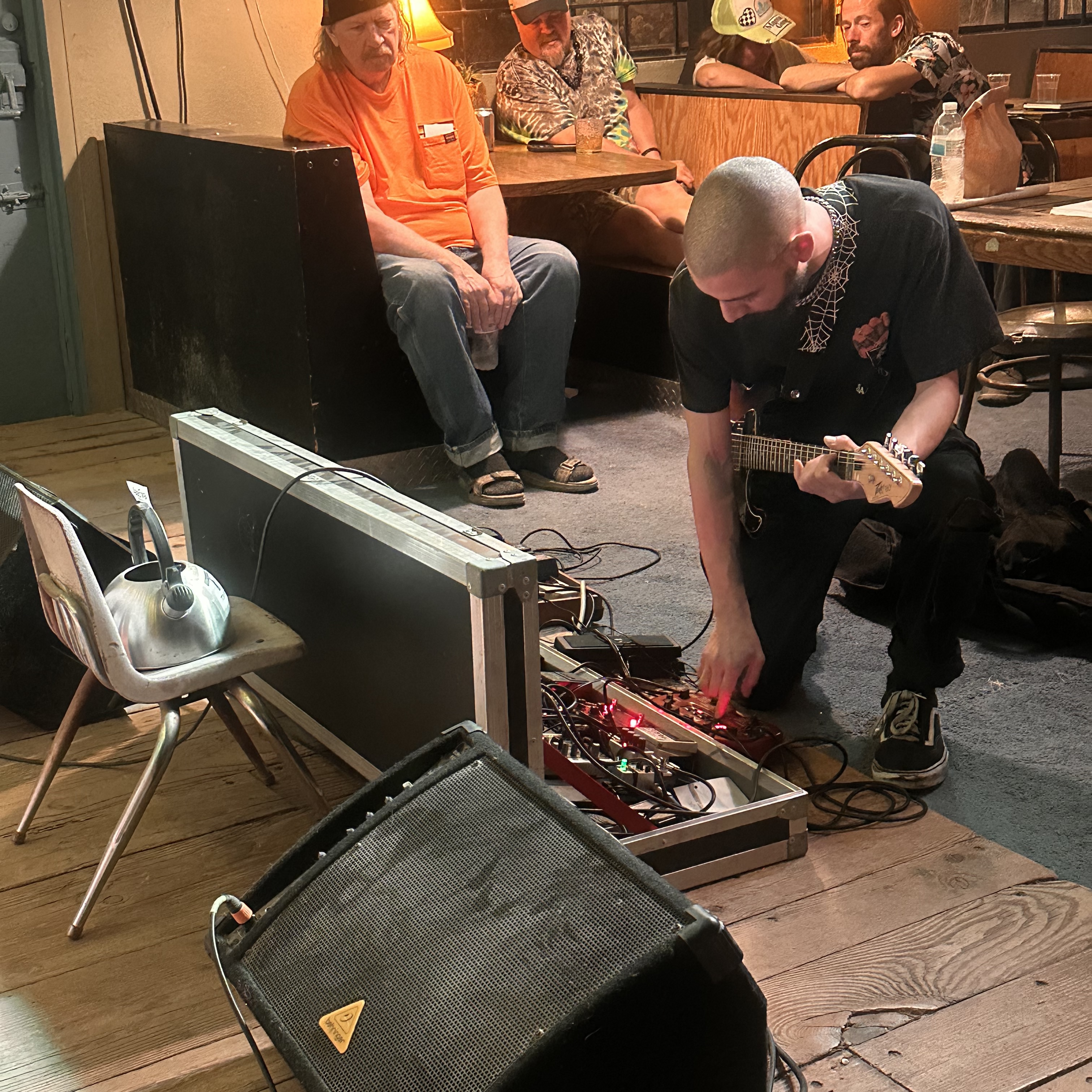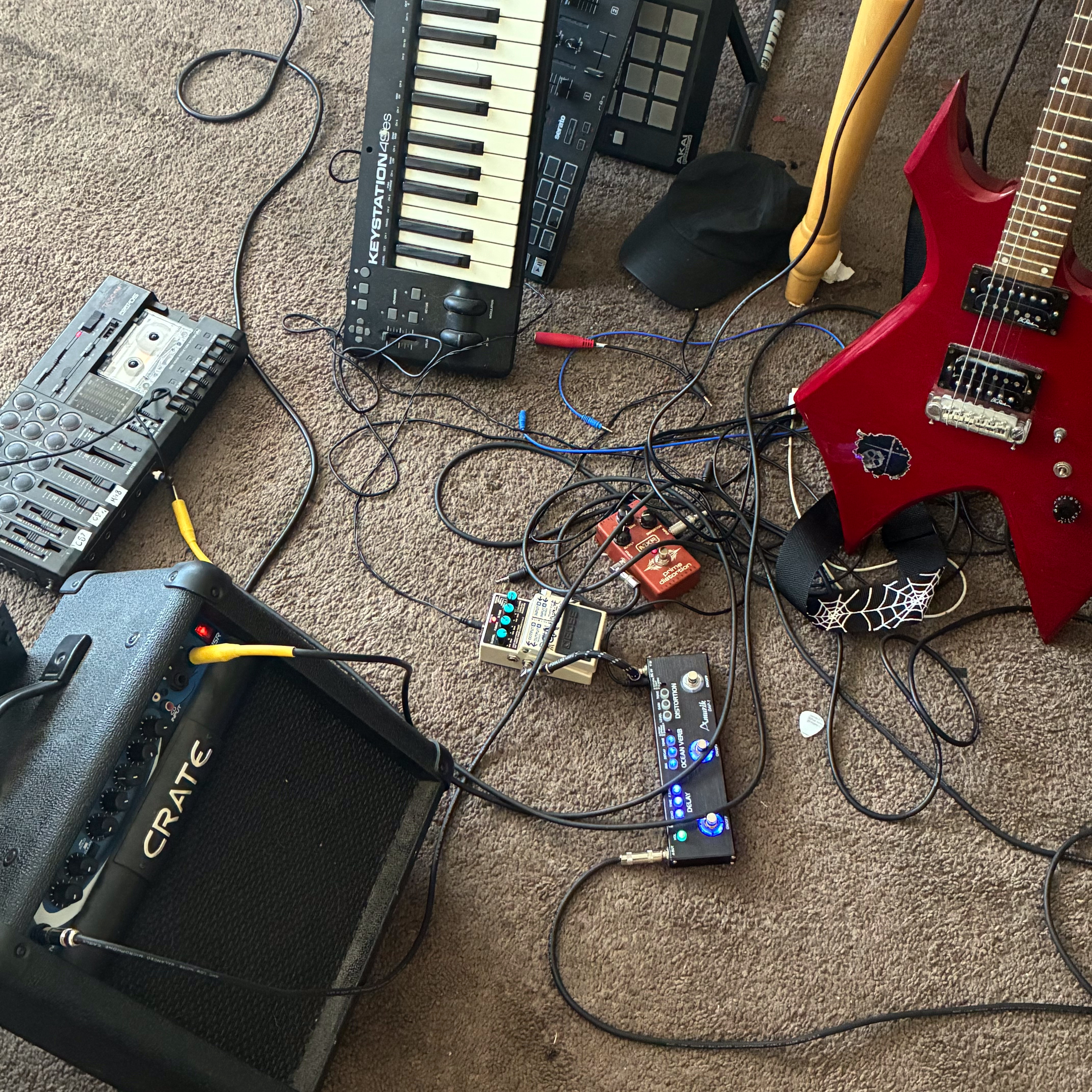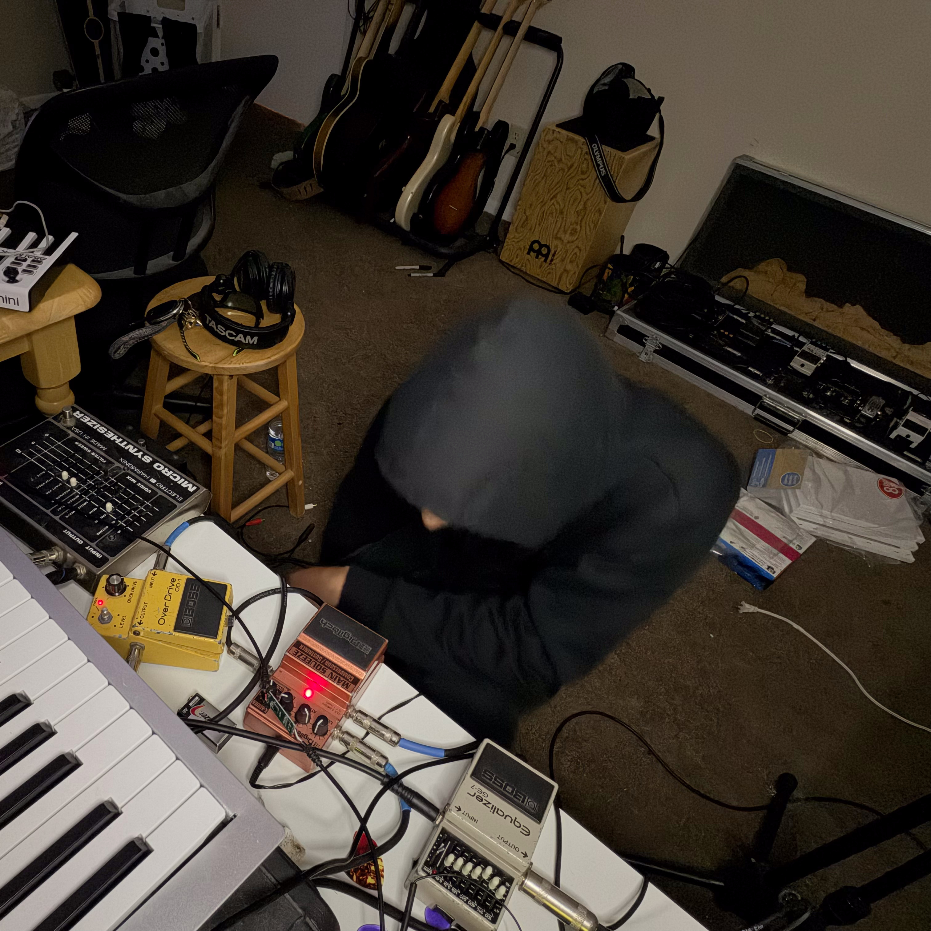 The drummer, synthesist, and guitarist plays with sound, shaping beats and melodies with odd textures, sometimes recording initial ideas onto cassette tapes that have been warped by flame or configuring arrays of pedals to be played in unison, or micing up amps in rooms with interesting acoustics and capturing that space from different angles.